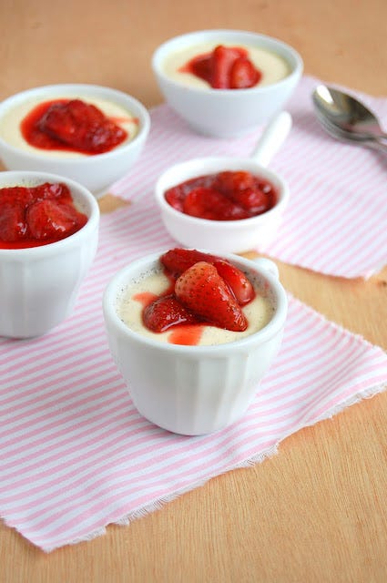 Aqui, se você quiser, pode dividir a receita em duas e fazer a panna cotta para servir com outras frutas, ou fazer os morangos assados para servir com outras sobremesas, como arroz doce ou sorvete.