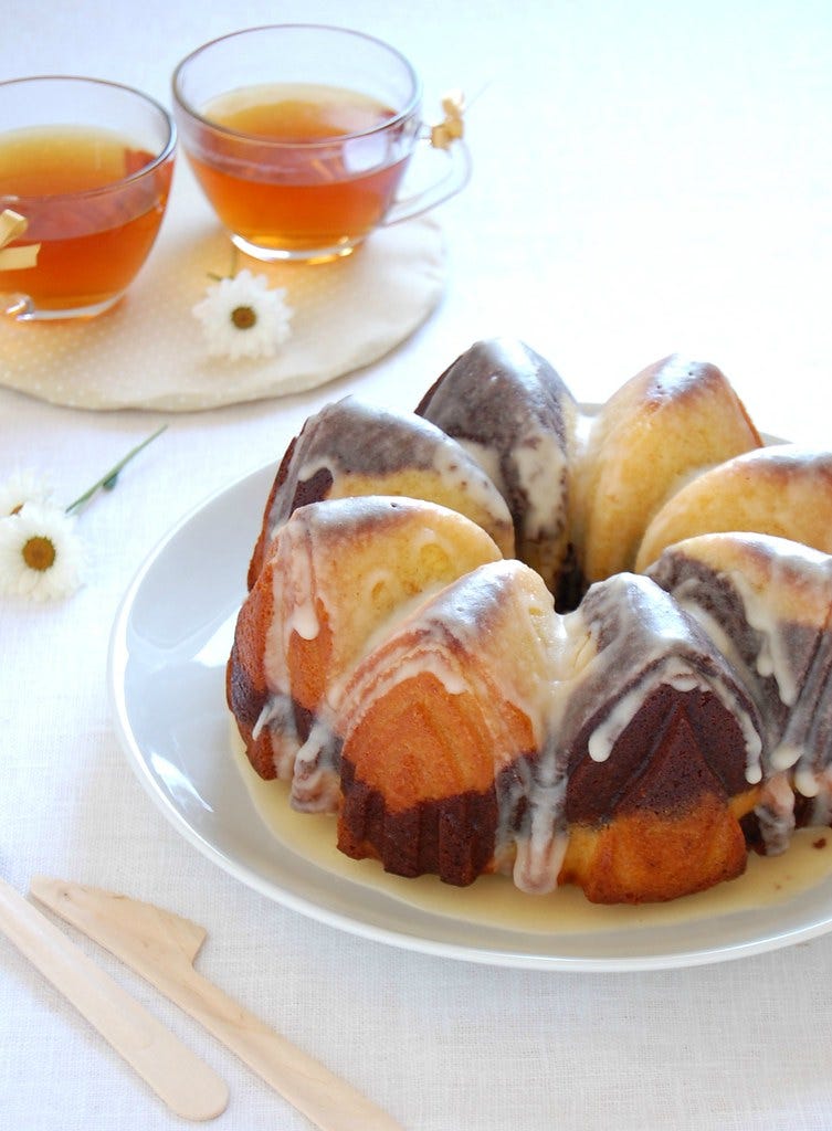 Bolo mármore de tangerina e chocolate com cobertura de tangerina